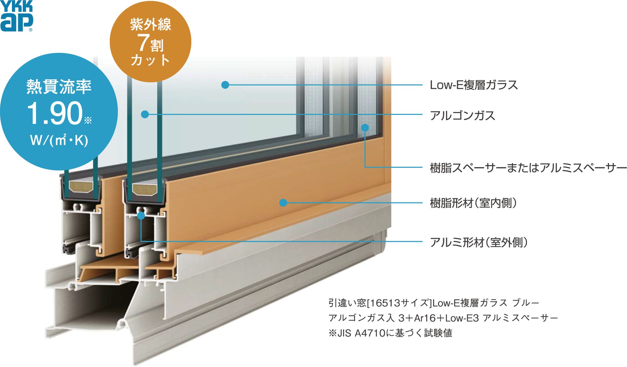 室内の温度が最も逃げやすい「窓」には、信頼のYKK AP 製ハイブリッド窓「エピソード2」を標準採用。室外側に耐久性の高いアルミ、室内側に断熱性の高い樹脂を使用し、さらに空気よりも熱を伝えにくい「アルゴンガス」を封入した複層ガラスを組み合わせることで、国内最高クラスの断熱性を実現しました。