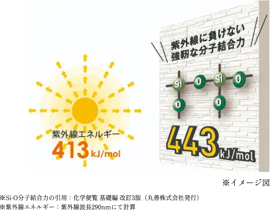 「プラチナコート(30)」は分子に443kJ/molの結合エネルギーを持つSi-O結合を含みます。Si-O結合は紫外線エネルギーの413kJ/molを上回る安定した結合力を持つため、外壁材をしっかりガードすることができます。
